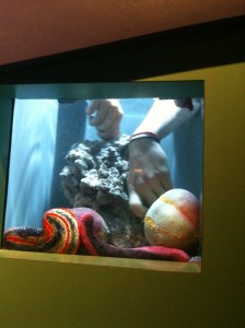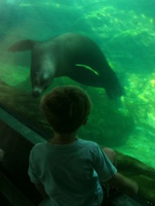 However, this day was pretty close to a perfect visit. We hung out for about two hours (maybe more, I lost track of time honestly) and we got to see and do anything and everything we wanted. We even caught a part of the children’s show, which we never ever do really because we’re either not there at the right time or never time it just so to see that along with our other regular stops (movie on the wall and diver shows mostly). We also happened to be there on the hottest day of the summer to date, so I promised T it was a-OK to water play as much as he wanted; of course he pretty much bee-lined outside to do that first thing. Cool. I even let him spray me with the water, which made for some great laughs all-around. Some other mom accidentally sprayed me, too, but whatever, it felt great given it was around 90 degrees outside (and again, it brought on many more laughs).