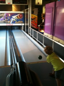 But this time we did pony up about $5 worth of plays, which included one of our favorites, Bowlingo. This is a miniature bowling game where the balls are about 1/3 the size and no finger holes to worry about with a three-year-old. We always just split one game since we are dealing with the attention span of, well, a three-year-old, but this time T was so much more into it. Maybe it was the strike he threw on his first roll out, or maybe it was just luck, or both.