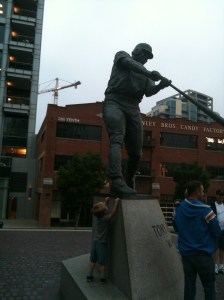 After that we headed on over to the Tony Gwynn statue. Because the statue sits atop a grassy knoll area of this vast park space, it was hard to get T to stand still with Tony for a photo opp, but I managed to capture the moment as it happened.