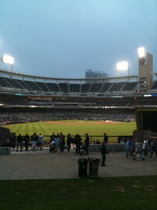 While it was the second-to-last home game of the season for the San Diego Padres, I have to say I am glad we waited until this time and this age for T to make this first visit for many reasons. First off, the Padres had a terrible season, which meant that tickets were freely available last-minute. That worked out great for us since we didn’t buy anything ahead of time as this was a very last-minute decision just days earlier. Second, with T being almost four years old, he could enjoy some of the interactive playing that the stadium has to offer, such as the kids’ ballpark area. Finally, staying up for a night game every once in a while isn’t as destructive to T’s (our) routine as it might have otherwise been had T been an infant or young toddler. In other words, it wasn’t a Broadway production to get there (i.e., no stroller necessary), nor was it too long of a visit or over-stimulating to where we’d later regret rather than enjoy the outing.