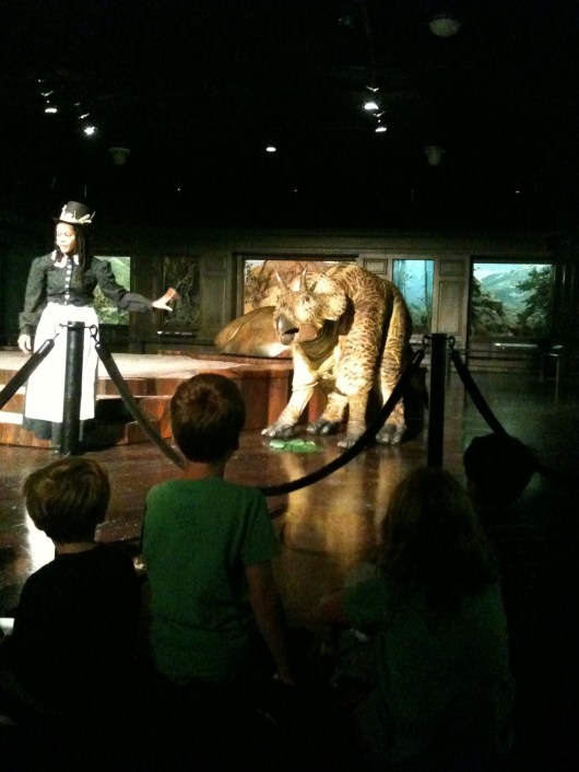 We also took time on our visit to take T upstairs to the darker but just as realistic-feeling Dinosaur Encounter. Twice daily NHM-LA puts on a puppet show where staff get inside of semi-animatronic dinosaur suits and behave as baby dinosaurs theoretically would have in their eating, sleeping, and other life habits. The show we caught that day was the baby Triceratops show, and the other show that alternates with this is the baby Tyrannosaurus Rex (which we’ve seen several times and can be a little too scary for the under-three set – fair warning!). On some days, staff will perform a third show called Ice Age Encounter that is about the saber-toothed cat, which was a native species in the Los Angeles Basin back when they roamed post-dinosaur era (we’ve not seen this show yet ourselves).