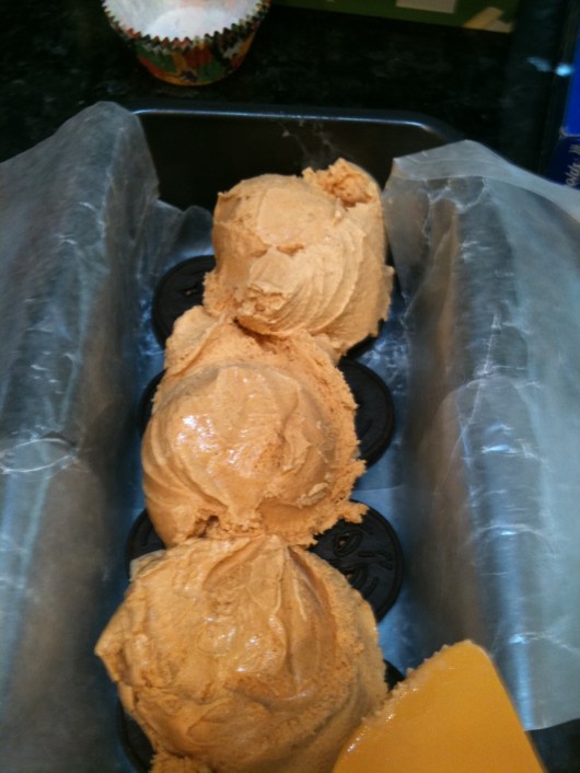 2. After letting ice cream sit countertop in its carton for a few minutes to soften slightly, place 3 large scoops of the pumpkin ice cream equidistant along the length of the loaf pan on top of the 8 cookies.