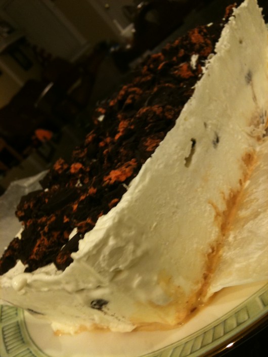 I didn’t want to overdo it with the pumpkin richness, especially since my T-man is involved (he’s a vanilla fan), so I alternated the one pumpkin layer of ice cream with a plain vanilla layer. Of course, if you have a crowd who just LOVES pumpkin, try it out with a double-pumpkin, no vanilla option. I also did not sweeten my whipped cream because of the existing sugars – and again, overall richness – of the other ingredients (cookies and ice creams both).