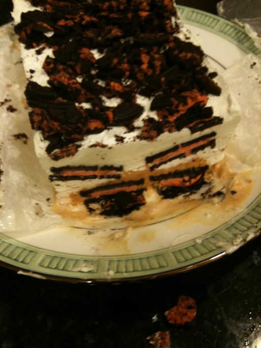 Other ideas for topping your terrine: Drizzled pumpkin butter (another Trader Joe’s product); crumbled plain vanilla Joe-Joes; or a savory, spooky scene made up of cookies, candies, and other decor (i.e., chocolate wafer gravestones with white or orange gel script on them; candy corn jack-o-lantern designs; or a large skull made up of black licorice). I was short on time, so crumbled cookies it was for me. You could even change the layers and overall flavor from a cookies-and-cream variety to another cookie flavor by using chocolate chip or peanut butter cookies. The possibilities are endless really.