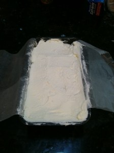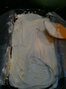 8. Take the other ½ of your whipped cream and smooth over the ice cream layer, which should thinly cover ice cream entirely and almost come to the top of the loaf pan.