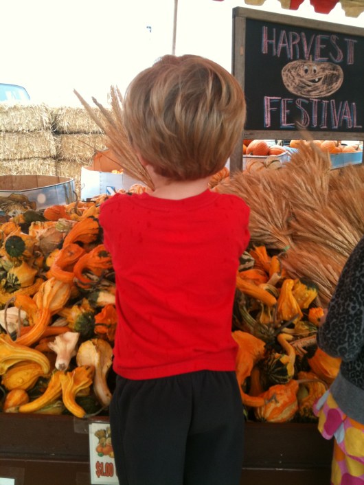 You will find several carnival-style games down at Pa’s (win-a-goldfish, ring the bell with the hammer and win a prize, etc.), but T’s not quite drawn to those just yet. And that’s fine… keep on riding – and head-holing – T! There’s also a pony ride on-site, along with a petting zoo, bounce houses, traditional fair foods… and, better yet, artisans on-site to style your pumpkin with your team name of choice while you wait. There’s also a lovely little Harvest Festival area, where you can hand-pick gourds, fancy miniature pumpkins, and other seasonal cuttings to round out your fall cornucopia and centerpieces.