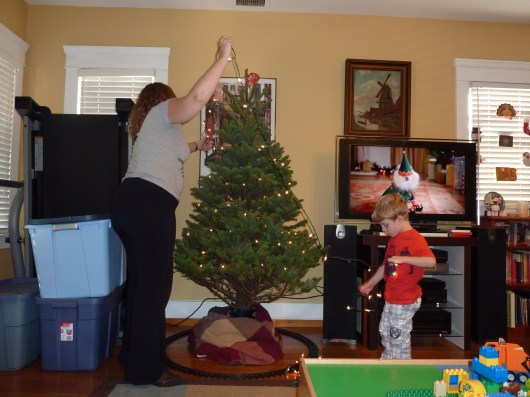 Once we got the tree home, T was very eager to help start decorating – immediately! I explained to him that we first have to get the lights out, test them (yes), and put those on first. As soon as he was on board with that plan, we got to work and got the tree lit up nice. T was a great helper following me back and forth around the tree hanging the lights.