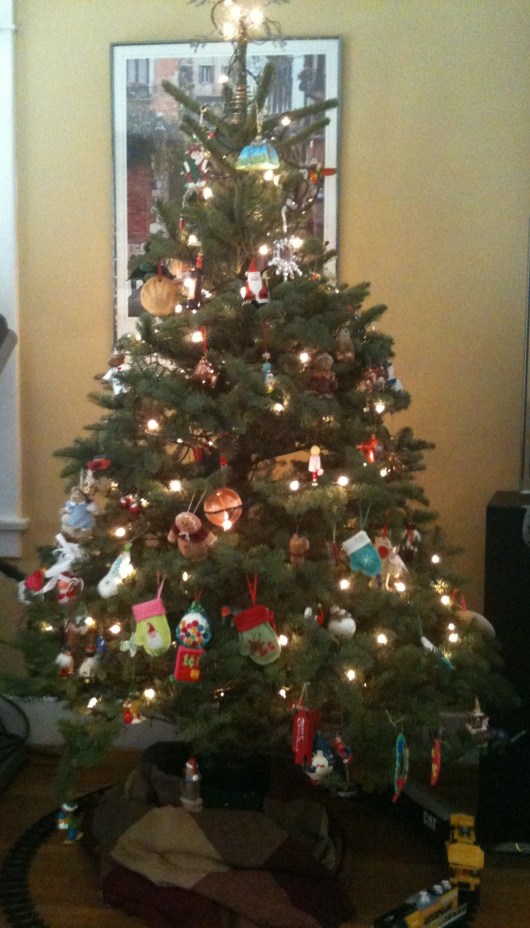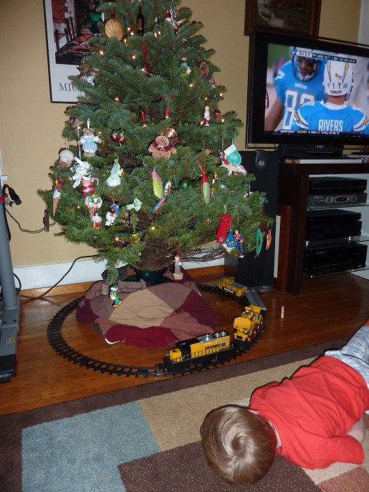 T enjoying his Christmas train (that Santa got him two Christmases ago) and his portion of the tree that he decorated.