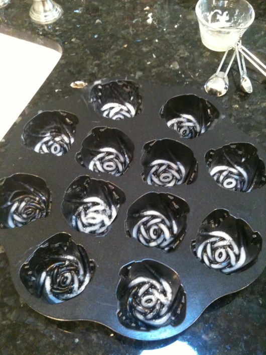 My buttered rose muffin tin. I used an OXO Good Grips silicone food brush to paint the melted butter into all those nooks and crannies, and it worked perfectly.