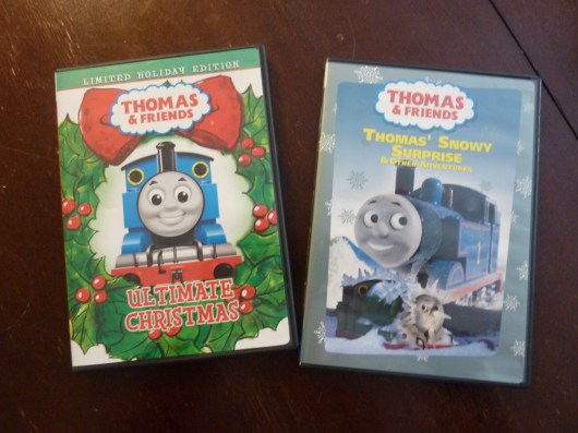 I'll begin with the obvious choices. My train-obsessed T would be lost without his two special Thomas the Train holiday DVDs.
