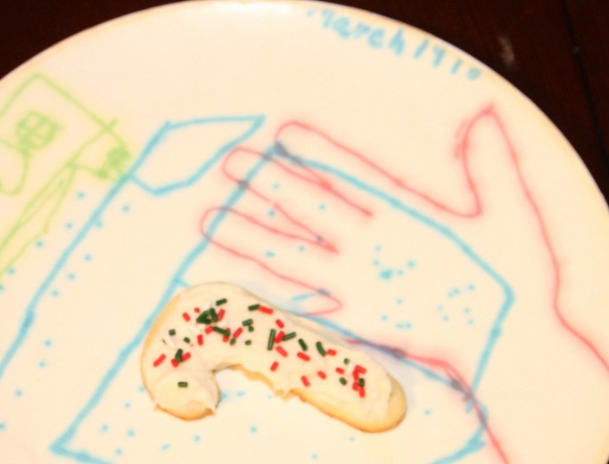 What better photo than one of my homemade plate (made at an age just a little older than T is now) holding one of my mom’s wonderful sugar cookies. Delicious memories!