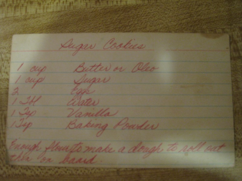 sugar cookie ingredients Posted on December 17, 2011 | 3648 × 2736 | Posted in Return to TREAT TUESDAY: My Mom’s Sugar Cookie Recipe ← Previous Next → My mama’s sugar cookie recipe card, front side. Share this:Tweet Email a link to a friend (Opens in new window) Email Like Loading... Post a comment or leave a trackback: Trackback URL.