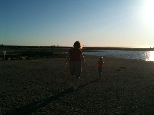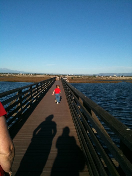 T and Grandma heading off in search of birds and other wildlife (and sticks and rocks) out at the Bolsa Chica Ecological Reserve.