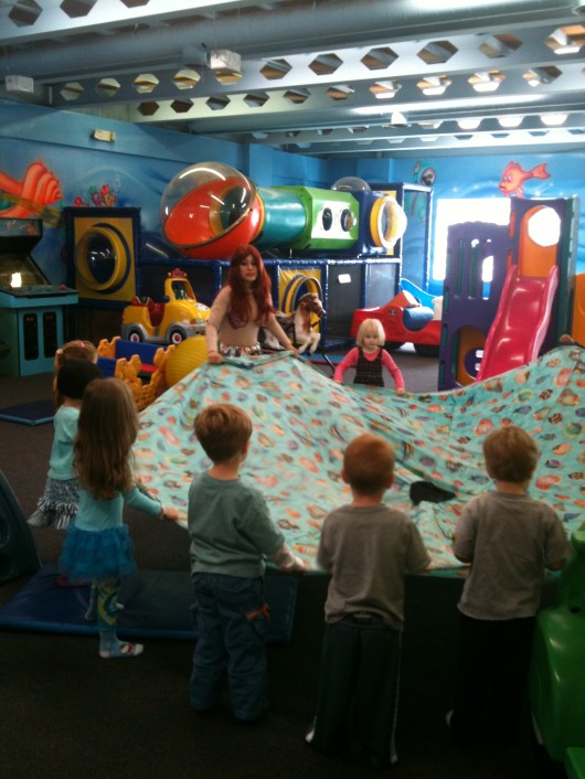 Last weekend’s party introduced us to a new (to us) local indoor playground called Under the Sea. This chain of play places takes the ocean theme to the extreme. Walls are painted floor-to-ceiling with various underwater murals. Riding toys are boats, fish, or other marine vehicles or animals. The moon bounce is anything but celestial given that the entrance is from the point of view of looking into a fish bowl or coral reef. Oh, and for special events, there’s a mermaid-for-hire to help augment that ocean theme, too!