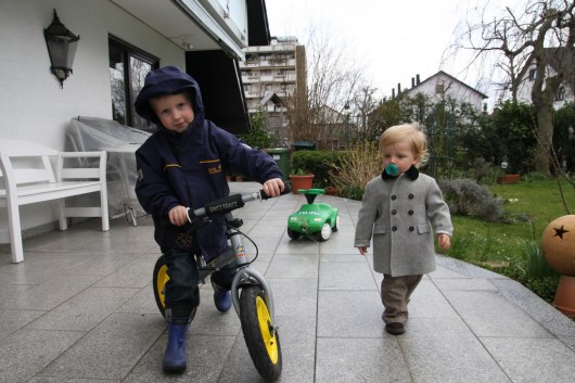A one-and-a-half-year-old T checks out one of his German friends riding on his balance bike. These types of bikes are and have been quite common in Europe for years in teaching children how to ride a bicycle at a very young age.