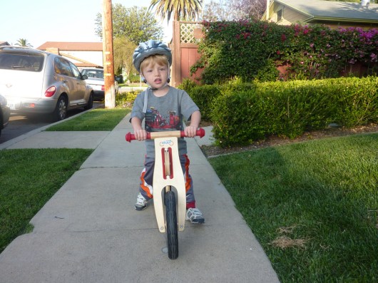 When T was one-and-a-half, we first learned about balance bikes while on vacation in Germany in March 2009. As the link above describes, a balance bike is a two-wheeled bicycle sized for a toddler and young preschooler that doesn’t come with any pedals nor any brakes. The design of a balance bike is such that the child can sit comfortably on the bike with both feet on the ground so they can first walk then progress to running and lifting their feet up to balance and roll along on the bike. These bikes are how German children had been learning to ride bikes for years, yet they weren’t anything I had seen or heard of to date in the States, most likely because we traditionally use training wheels in our culture. However, after seeing these bikes being used by kids as young as age two, and kids as young as three and four successfully riding traditional two-wheeled pedal bikes, C and I both knew that we wanted to buck American tradition.