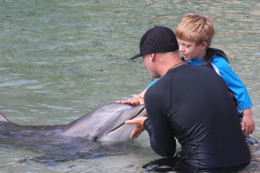 Trainer Cole leads T in some one-on-one time with Hua during a Wee Tots encounter at Dolphin Quest, Big Island, Hawaii.