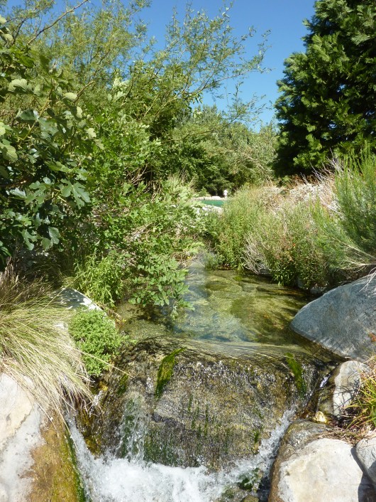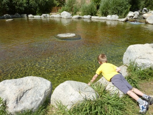 T touches the COLD (about 60′-65′ F) water at the Whitewater Canyon Preserve (CA) swimming hole. This is not part of the trout ponds but a separate, sheltered, shallow swimming area that’s been set up at the park for campers and other visitors to splash around in while enjoying time at the preserve.
