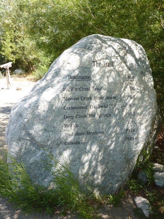 The engraved marker at the start of the trailhead leading out from Whitewater Canyon Preserve (CA) to the Pacific Crest Trail.