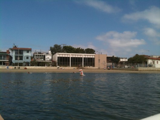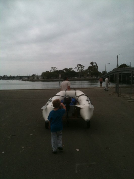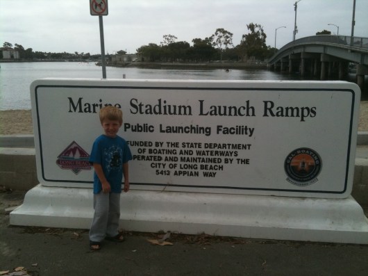 T in front of the Long Beach Marine Stadium launch ramp sign, where we drive down to launch our boat off of the sandy beach ramp area.