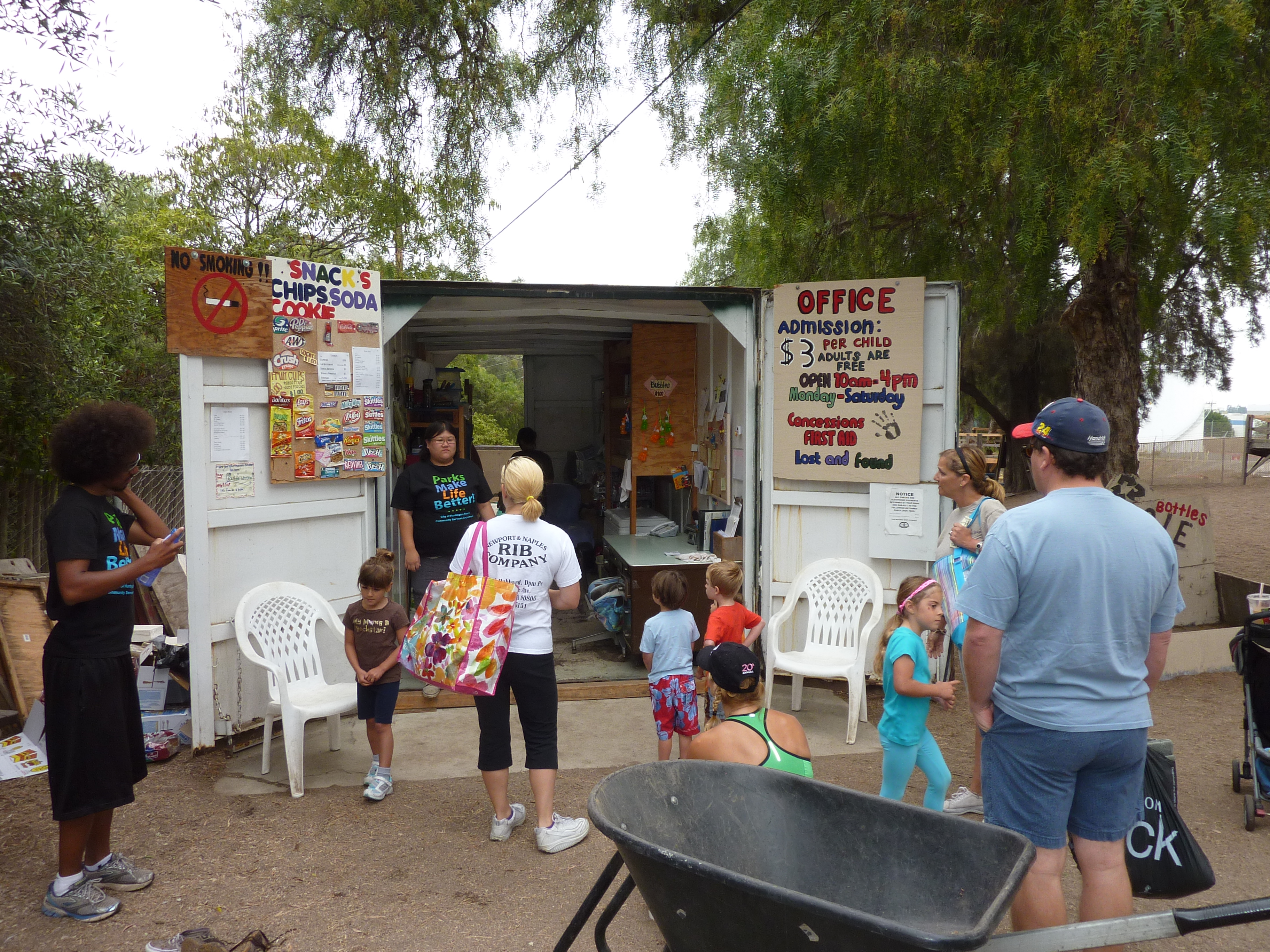 Us checking in at Adventure Playground. Yep, their “office” is a sea container – love it! Upon checking in, staffers convene small groups to go over all the rules while inside the park, including the consequences for breaking the rules. They really do a great job at making sure we all stay safe while still having a great time. Thanks HB Parks and Rec!