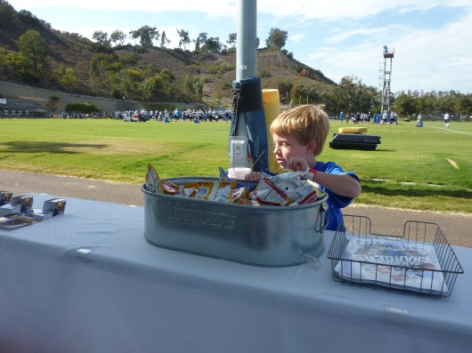 Thanks to T’s grandma and my mom, T and I got into a closed San Diego Chargers pre-season training camp session last week! For those who know me personally, you know my undying love and support of the not-always super-charged but always bolt-rific NFL team based out of San Diego, and it’s my long-term goal to pass along my fanatical frenzy to T at some point in his lifetime.