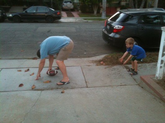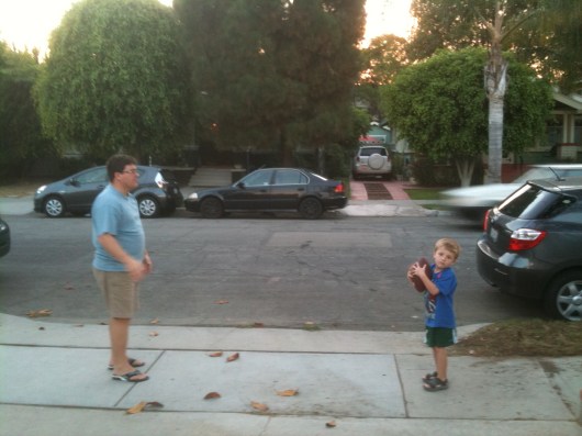 For now, while I can’t enjoy T’s team chants and cheers, we all can enjoy some photos of T tossing the football around with Dad during the Saturday college match-ups and the Sunday NFL opening games. T did pretty well with throwing AND catching I’ve got to say, pretty much just as he did when they tossed the baseball around together for the first time!