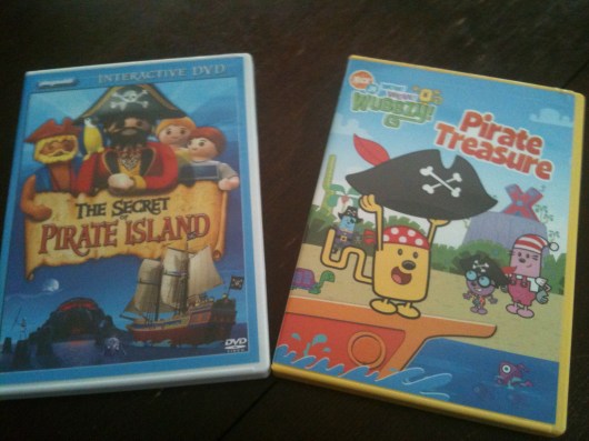 For the last two years or so, pirate-themed toys, LEGOs, costumes, t-shirts, songs, books, and DVDs – like these pictured above – have thrown down anchor at our house. Oh, by the way, T likes pirates.