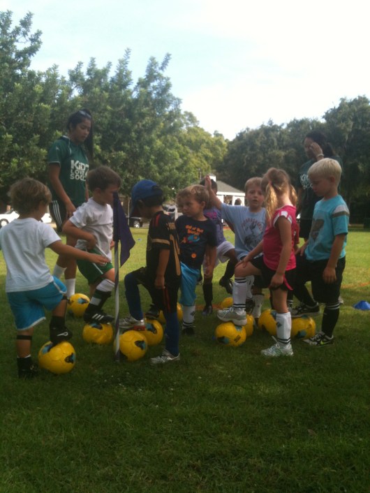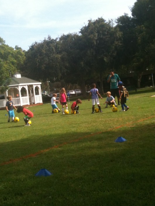 The kids use “small kicks” to move their soccer balls toward the red flag during their first Kidz Love Soccer class. This organization concentrates on teaching soccer skills through individual game play (notice how each child has their own ball?) rather than highlighting competition between teams or – at this age anyway – fighting over one ball.