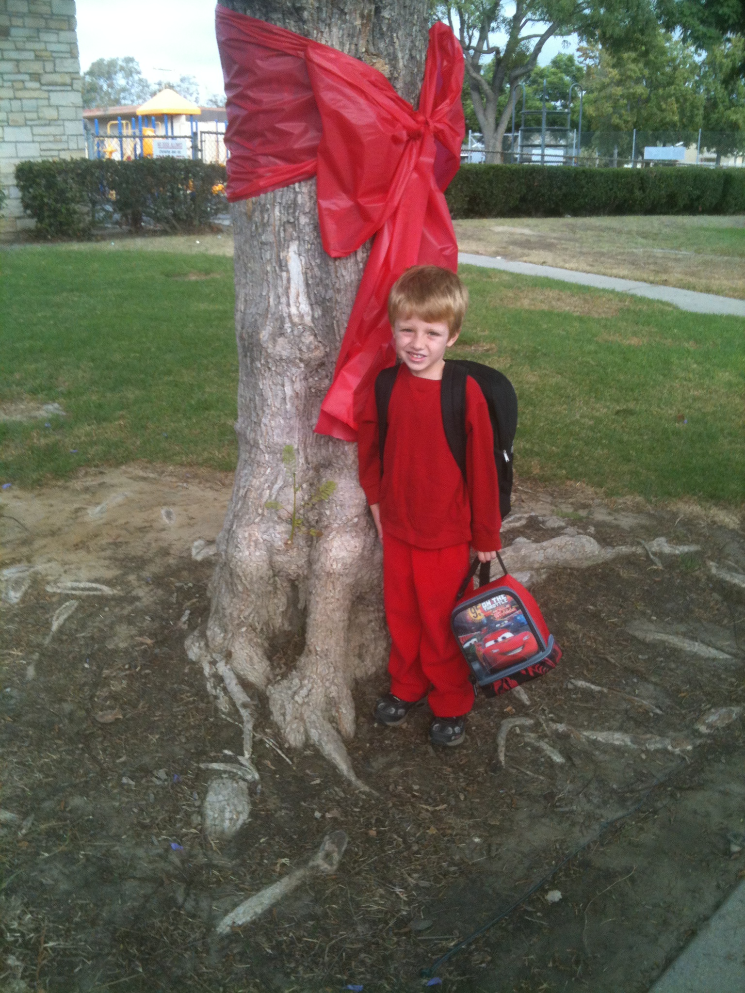 T really took it to heart when I mentioned that Monday he could wear red to school. I gave him a choice between a red shirt-blue pants or blue shirt-red pants. He asked why not both? Well, OK, then, both it was!