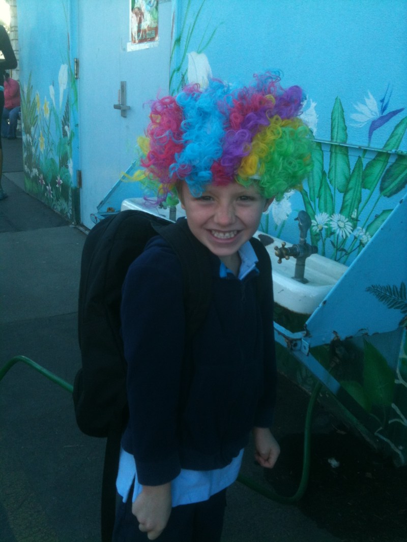 DAH DAH DAHDAHDAHDAH DAH DAH RedRibbonWeek… T sported his new “Rainbow Afro Circus” wig this Thursday at school for crazy hair Day during Red Ribbon Week 2012. While he was the only one in his class with this wig, others on campus had them. I guess the release of Madagascar 3 a couple of Tuesdays ago helped a lot of us parents out with a mess-free crazy hair day option (and for putting away an early holiday present of the movie, too!).