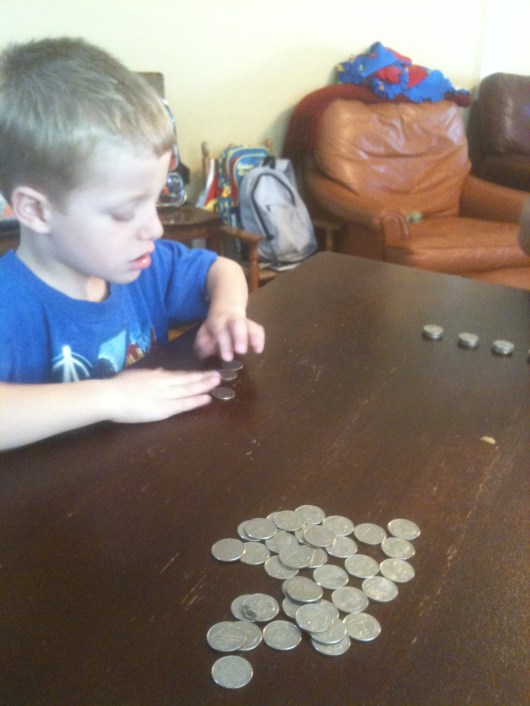 Just where does T get all his money, you ask? I know, I asked myself that, too, when I saw what he had on hand! Well, birthdays and Christmases are T’s big cash cows, for starters (of course), and most of the larger amounts already go into a long-term savings plan just for T. But there are other special occasions in the year where family will mail a $5 bill here and there, too. All of that paper money usually winds up in his wallet. As for all the coins? We at one time were giving T some loose change as part of his sticker chart rewards or for other spontaneous, above-and-beyond chore calls of duty. He also got a few coins from Easter egg hunts and other daily discoveries of coins in the street, playground, sidewalk… yeah, I think you get the picture.