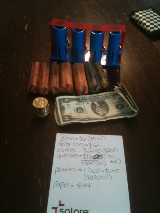 T counted coins as C rolled them. I was the scribe (accountant?) who wrote down the various subtotals.