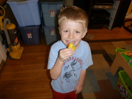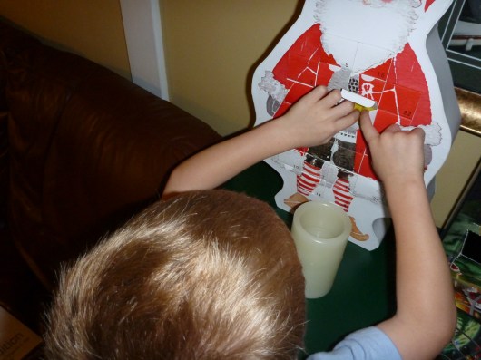 T and I had a jolly good time opening up the bins and bringing out the holiday cheer in the form of door hangers, table-top tchotchkes, and Advent calendars. Yes, that’s two calendars, RMT’ers. Turns out that while Grandma Shirl couldn’t send T a card-a-day this month as she did last year (she’s overseas and postage and timing would have been unmanageable I can only imagine), she did leave behind a cute little Santa Advent calendar for T to enjoy daily until the Big Day arrives. Toys received so far include small rubber stamps, a dollar bill, and a rubber duckie. Cute, fun, and so very T.