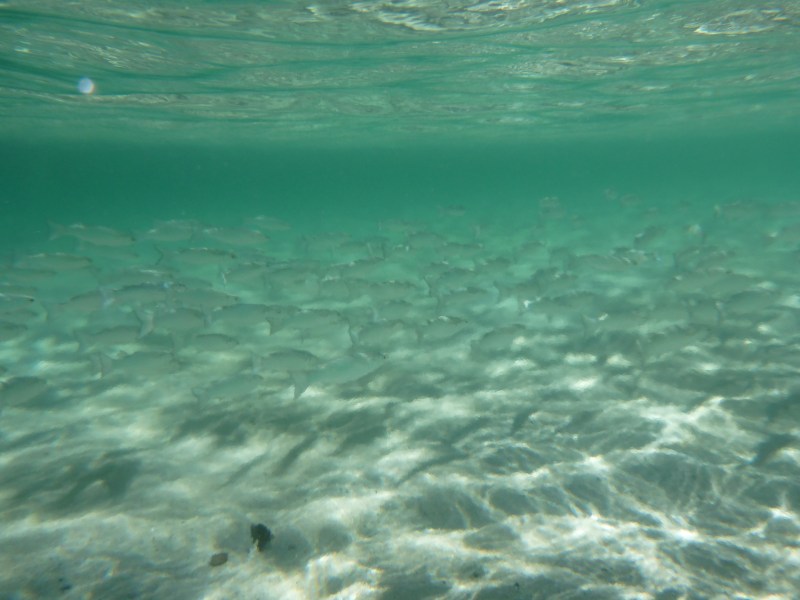 Mullet fish, I think. These would school in very shallow waters near the surface over the sandy bottom of the Hilton Waikoloa’s lagoon. We would follow them in knee-deep (sometimes shallower) water on foot until they’d regroup, turn, and head back the other direction.