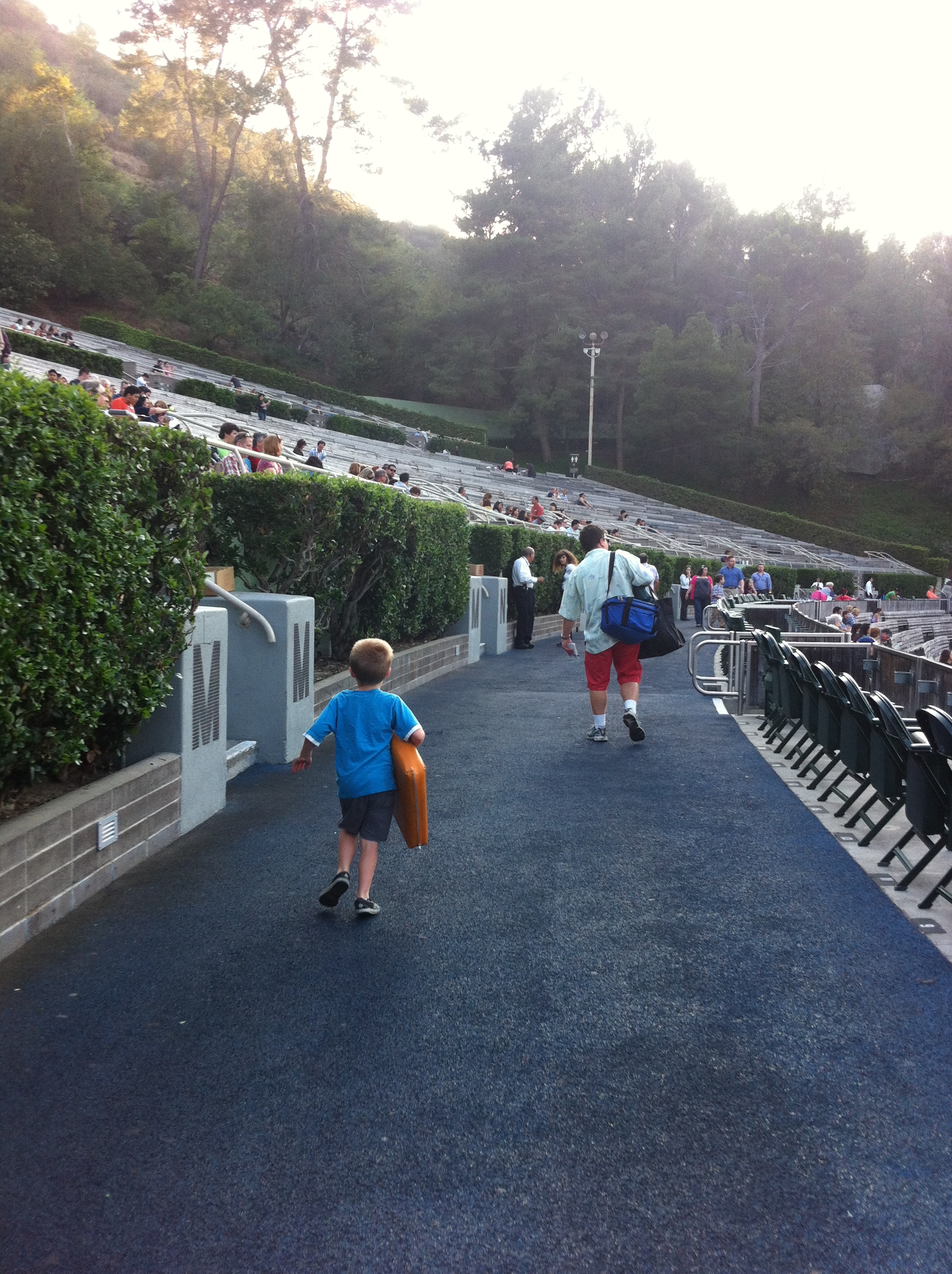 T and C heading toward the seats. Carrying a lot of food and drink is part of the fun of going to the Hollywood Bowl. Yes, you can take in your own food and drinks, including bottles of wine, beer, and other adult beverages of your choosing. Be responsible, RMT’ers!