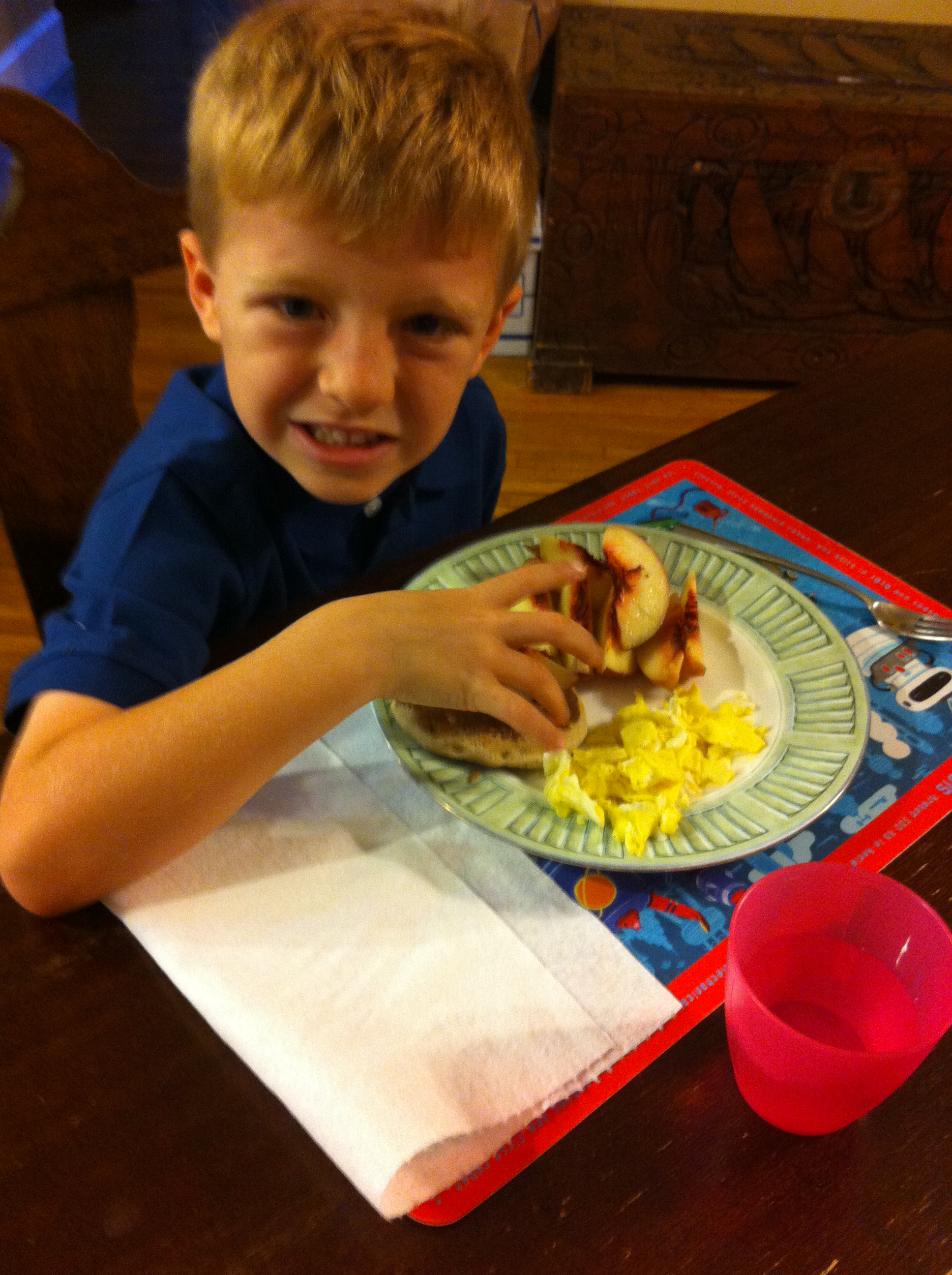 IMG_3193 Posted on September 4, 2013 | 1936 × 2592 | Posted in Return to First Day Of Kindergarten, Mostly in Pictures ← Previous Next → T’s “whatever” first day of K breakfast. He ate it all, minus part of the pancake that he took in the car with him. Share this:Tweet Click to email a link to a friend (Opens in new window) Email Like Loading... Post a comment or leave a trackback: Trackback URL.