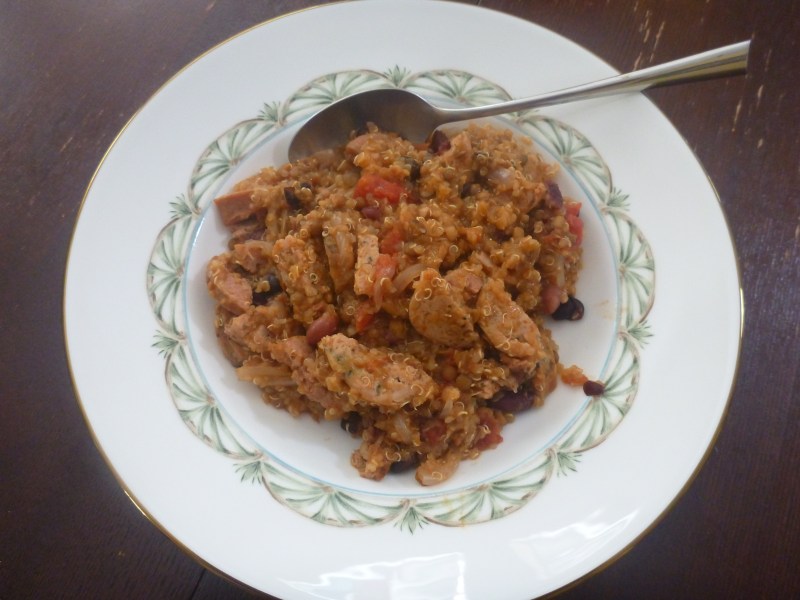 C does it again! On the first day of fall, he made a delicious one-pot meal of chicken and andouille sausage, beans, quinoa, tomatoes, onions, lentils, and a small splash of enchilada sauce. I swear with a little ricotta that this could also make a great filling for a lasagna.