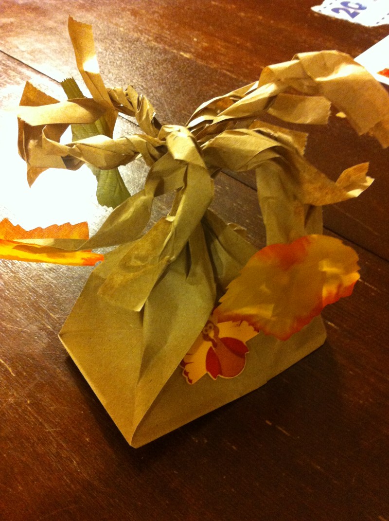 If you don’t have a group to gather in gratitude this season, your kids can make their own individual family trees. Take a paper bag, cut 1″ strips down about halfway from the opening while the bag is still closed, open the bag and twist the strips into branches. Then glue either pre-crafted leaves or cut out your own leaves and affix as many to the branches as there are members of the family. Another shout-out of thanks to our school’s PTA for this wonderful art project they gave to all the kids during our “Lunch Art Bunch (LAB)” earlier this month.