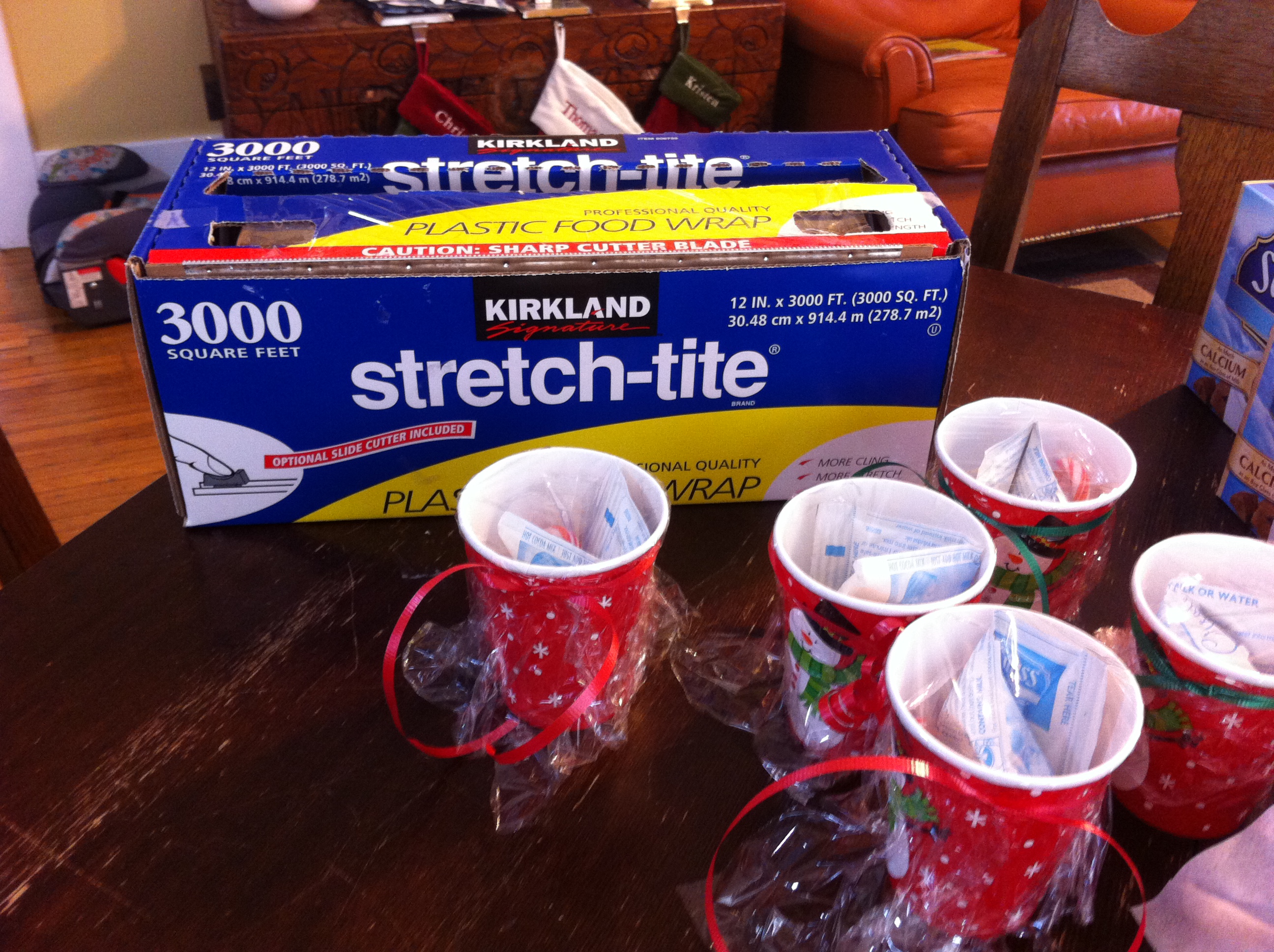 Thank goodness I switched to using plastic wrap for the “lids” rather than persist with the gift tissue. Not only did they seal better but the ribbon went around easier and it didn’t obstruct the cute cups either!