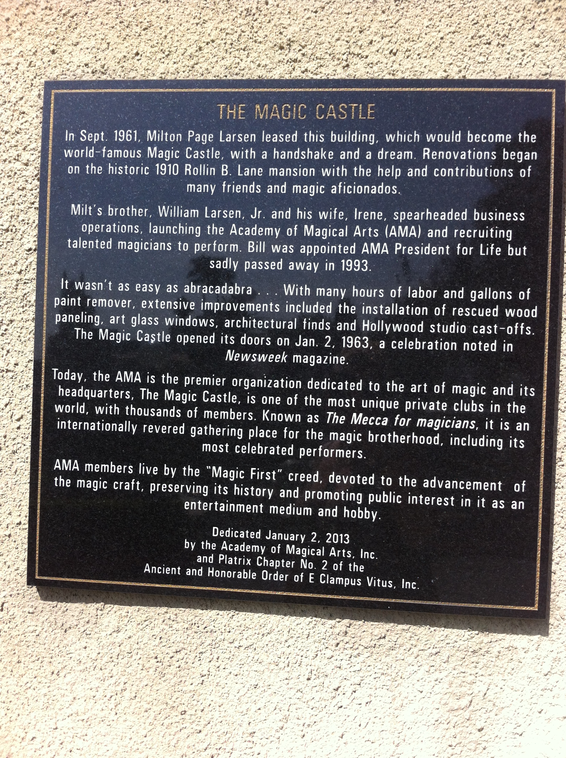 This plaque briefly tells some of The Magic Castle’s more than 100-year history as a building and 50+-years as a private club. It only scratches the surface. The real magic is inside, RMT’ers.