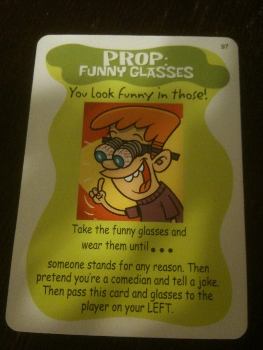 Players take turns drawing cards, and cards accumulate equally per player (complete with all their instructions and directions) as “rounds” are completed (a round is one card draw for each player). Players are encouraged to set a limit on rounds before starting game play depending on the number of players involved (the less players, the more rounds, and vice-versa). Why, you ask?