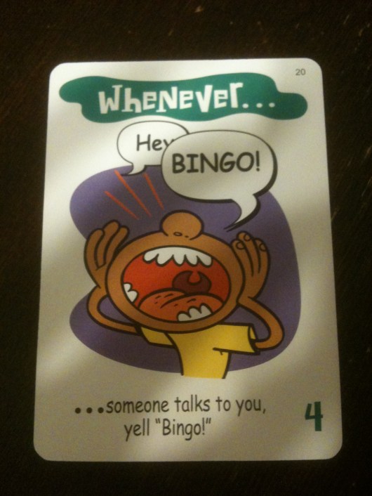 The wacky cards are divided into two categories: “Always” and “Whenever.” If a player draws an “Always” card, that player must always do what that card says at the start of their turn (i.e., T had a card that directed him to ask a player for the exact time at the start of his turn every time). If a player draws a “Whenever” card, they must do what the card says whenever another player does something specific (i.e., T had a card that told him to shout “BINGO!” whenever another player talked to him during game play, even when not his turn).