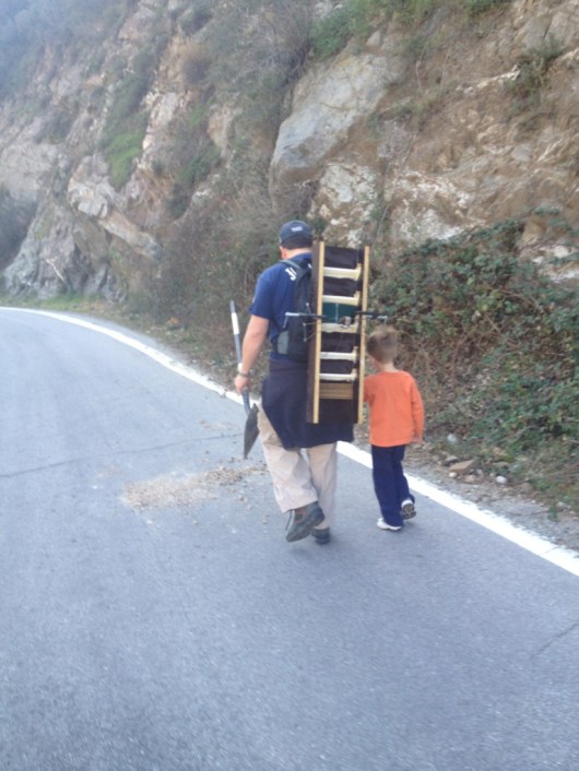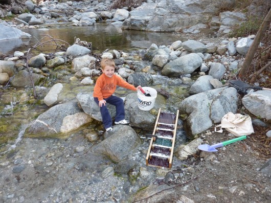 C's newly crafted sluice box in action. Yes, that's T along with the sluice in the middle of the flowing river. While the boys brought back dozens of rocks, sadly none were of the golden variety.