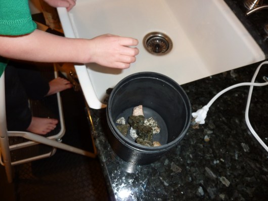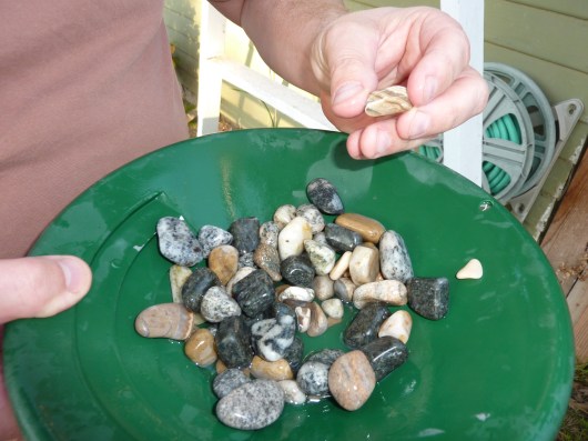 Before placing the rocks into the tumbler drum, T washes all the rocks of any loose debris.