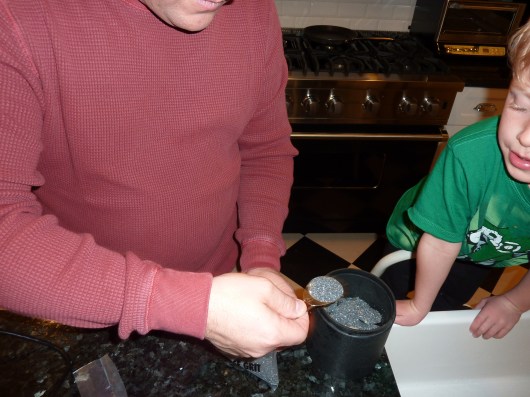 C and T started their first batch of rocks the Friday after Valentine’s Day using some of the ones they brought back from one of their gold-panning trips. C also took a sledgehammer to a leftover piece of granite from our kitchen remodel a couple of years ago and tossed those pieces in with the river rock pile. After all, all a granite countertop is, RMT’ers, is a heavily sanded and polished piece of rock. If the scraps from our countertops come out looking as good as the main piece, that’d be pretty cool… we’ll see what happens!