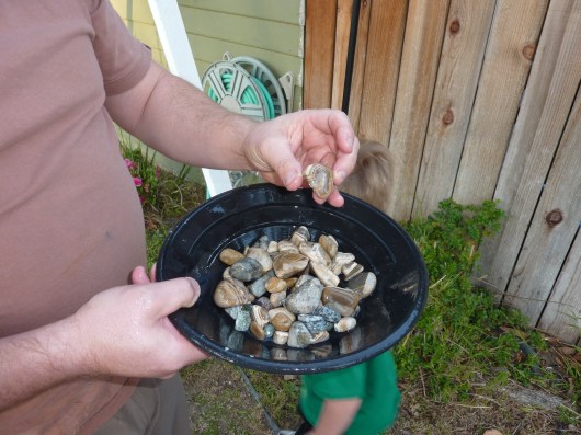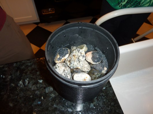 Batch one of two in our rock tumbler. Some of the ocean rocks wound up being mixed into the river rocks depending on their original size and texture.