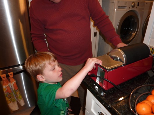 Are you ready to tumble? T turns on his and Dad's new rock tumbler. Stay tuned!