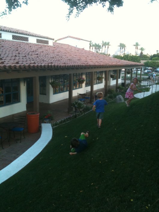 The three bigger kids (including T) rolling down the grassy slopes in the main courtyard at La Quinta Resort and Club (CA) outside of the patio at Adobe Grill, the Mexican restaurant on-property where we enjoyed dinner together as a group while listening to live music (check with resort on schedule).