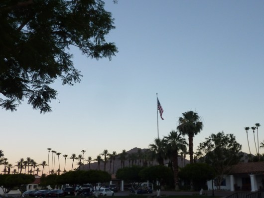 A distant view at sunset of the hotel reception building and “main flagpole” (which is oft-referenced as a landmark to help yourself find your way around the 40+ acres) at La Quinta Resort and Club.